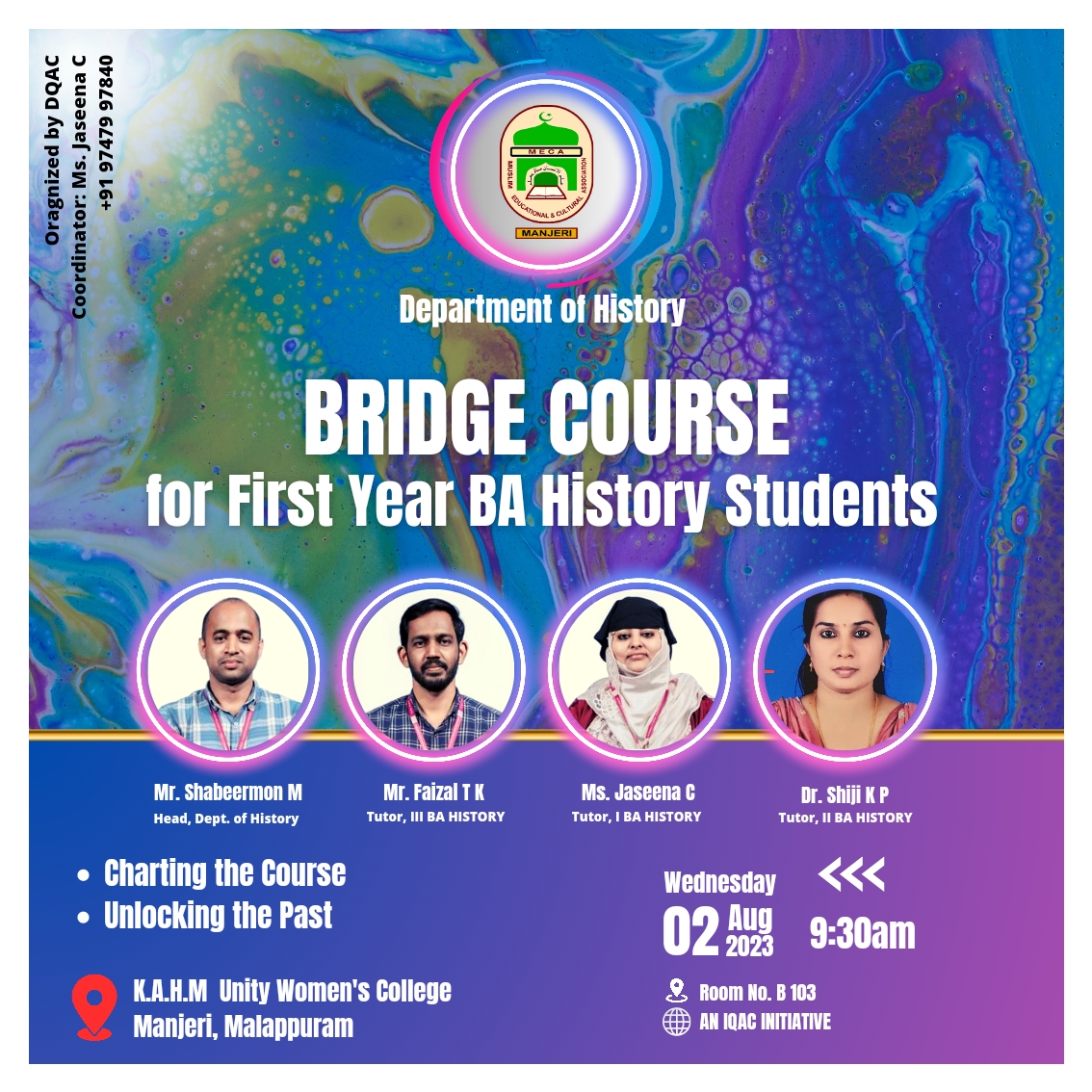 In this session, Jaseena C, Assistant Professor and tutor of first year BA History, provided an overview of the program structure and requirements for the BA History course. She explained the core subjects, elective options, and credit distribution. Jaseena C also highlighted the importance of curriculum planning and the significance of meeting academic prerequisites.